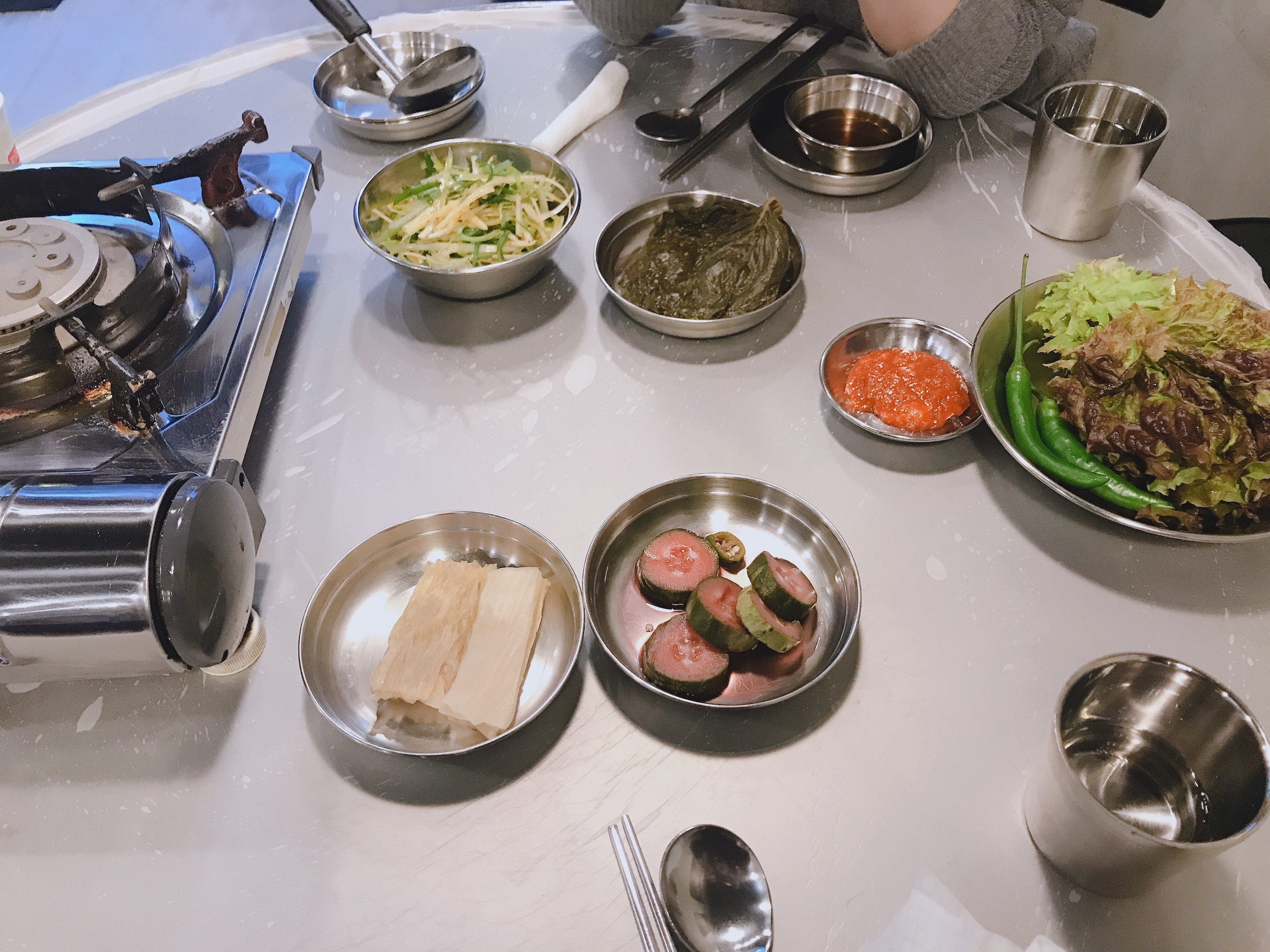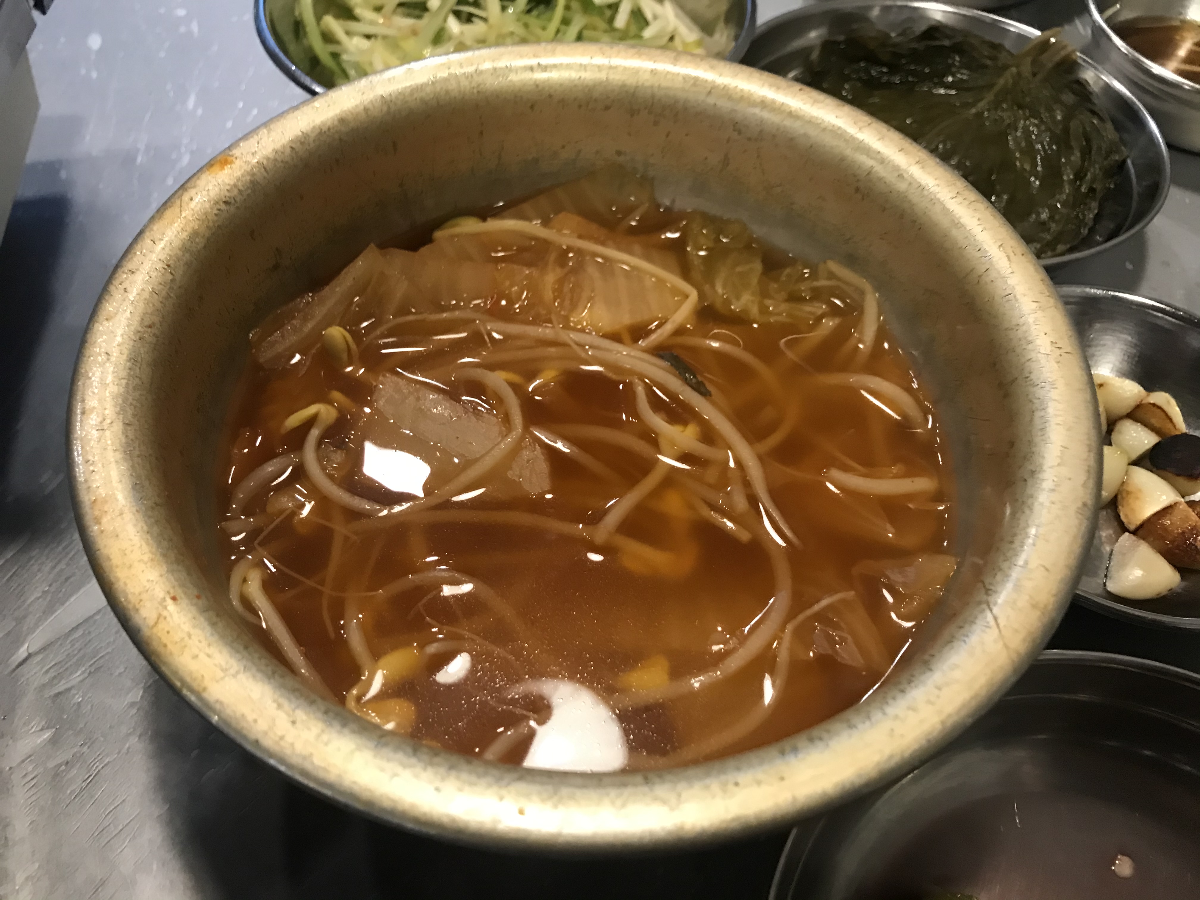 서비스로 나오는 김치콩나물국, 사장님께서 직접 만드신 깻잎절임 너무나 맛있어요.